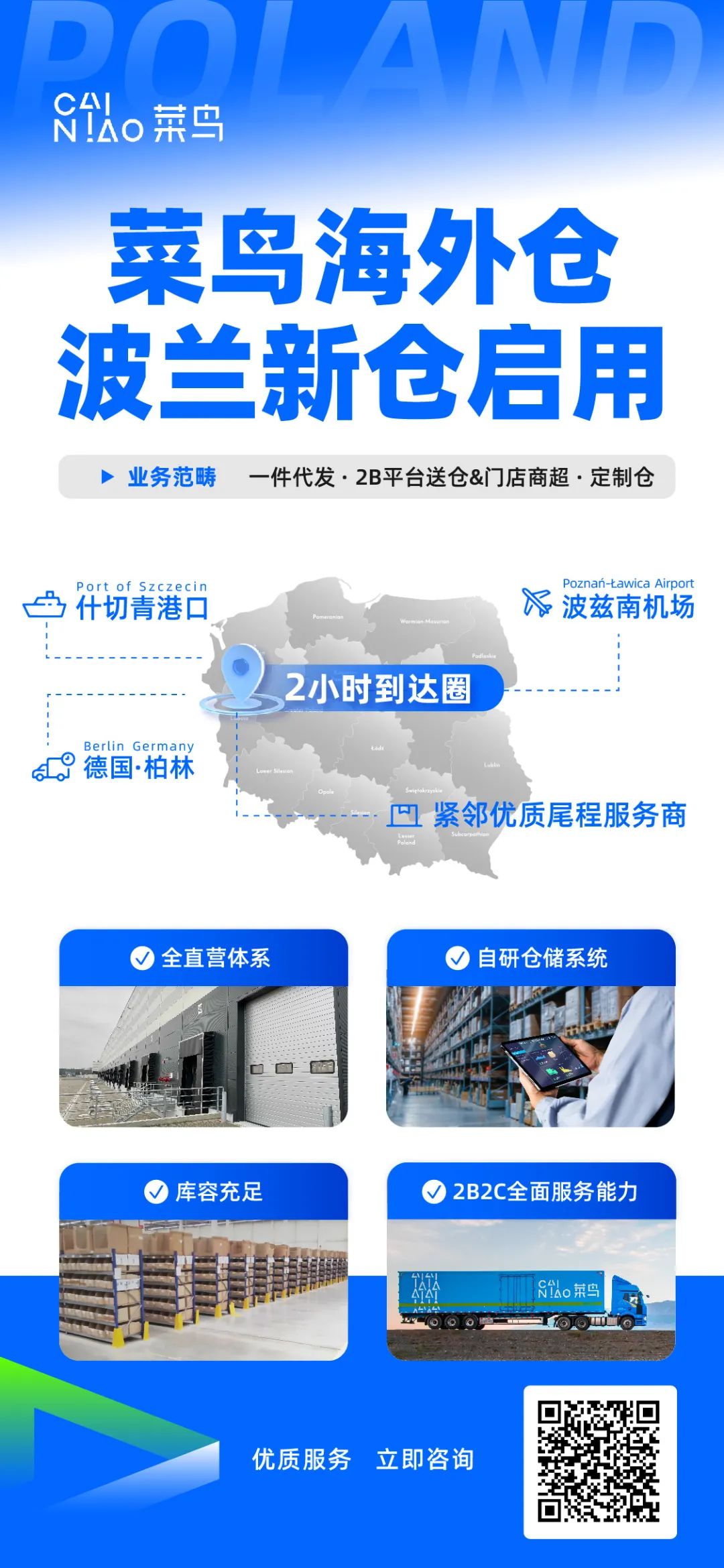 为进一步满足跨境电商快速增长的物流需求,菜鸟全球供应链在波兰罗基特诺地区的新仓也于近期正式投入使用。作为菜鸟在波兰的第三个海外仓,该仓可为跨境商家、出海品牌和本土品牌提供B2C与B2B仓配以及全链路跨境供应链解决方案。