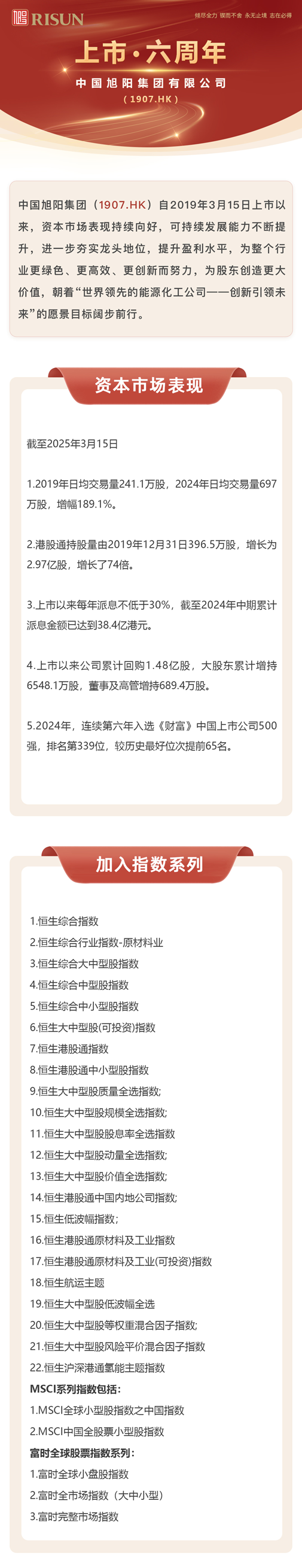 2019年3月15日,中国旭阳集团成功在香港联交所主板上市,目前已被纳入恒生指数系列、富时罗素指数系列、摩根士丹利明晟(MSCI)指数系列下多个分类指数成分股,是深港通、沪港通交易标的,进一步彰显了公司在资本市场的吸引力和影响力。