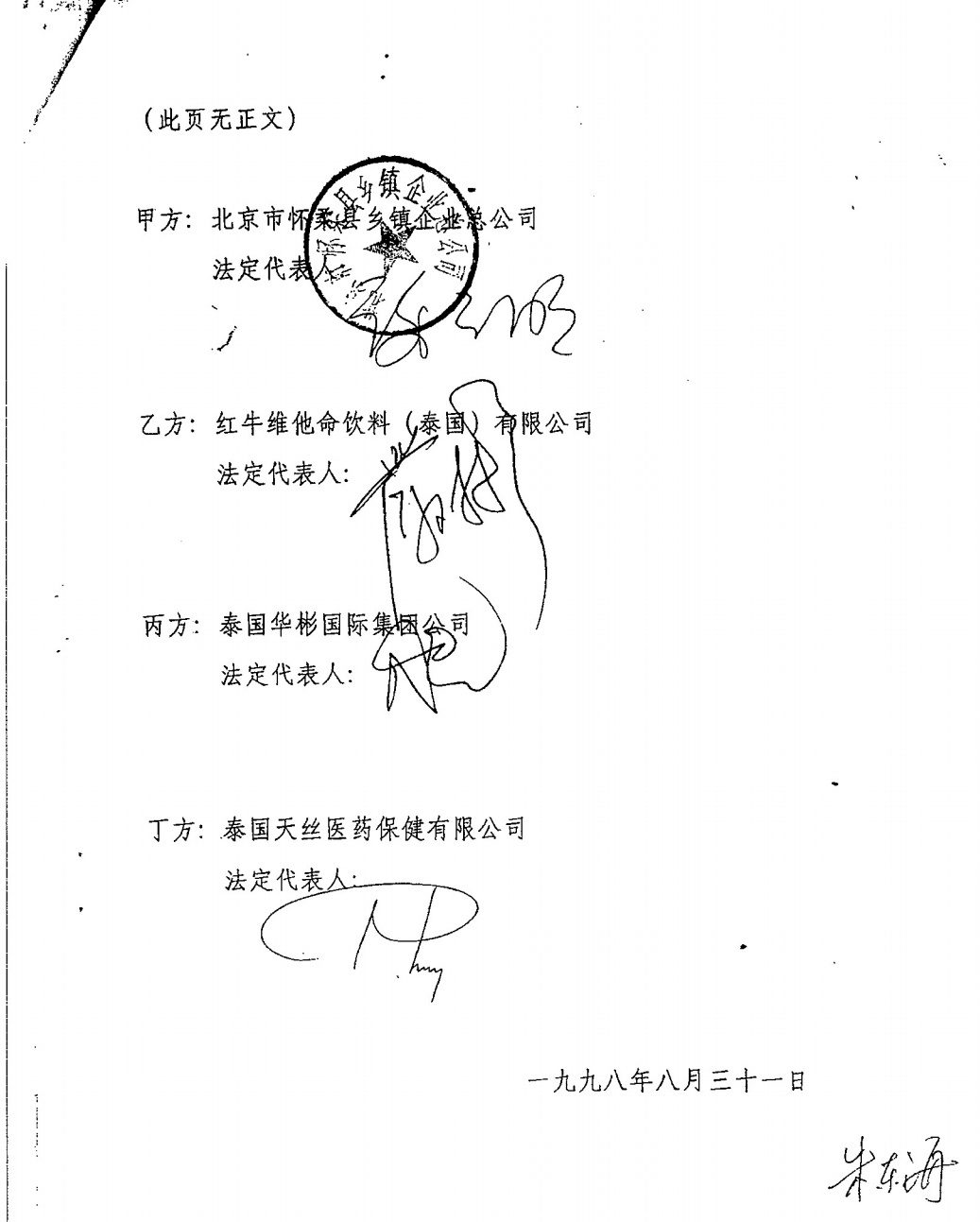 2、泰国天丝强调50年《协议书》没有加盖企业公章。《98年合资合同》签字页,泰国天丝签署时没有加盖企业公章,并且PAVANA女士是泰国天丝的签字代表显然,PAVANA女士签字以及签字加盖公章,都是泰国天丝对外签署协议的惯例,且泰国天丝对该两种签约方式均认可其合法性、有效性。泰国天丝将《95年合资合同》的签章页与《协议书》并列在一起做对比,但却故意不与《98年合资合同》做对比,意在误导媒体与消费者,扰乱视听。
