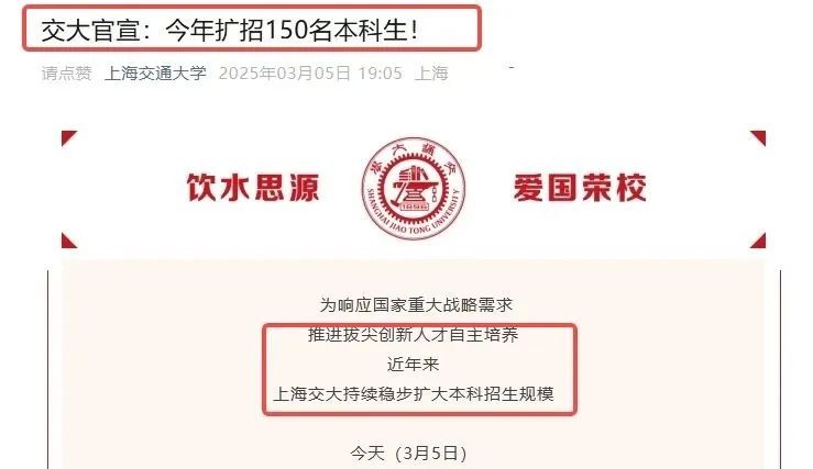 重磅消息!距离高考不足100天,2025清华大学宣布扩招150名AI+创新型人才!紧随其后上海交通大学也宣布扩招150人!皆在培养具有人工智能(AI)技术素养、具备突出创新能力的复合型人才。