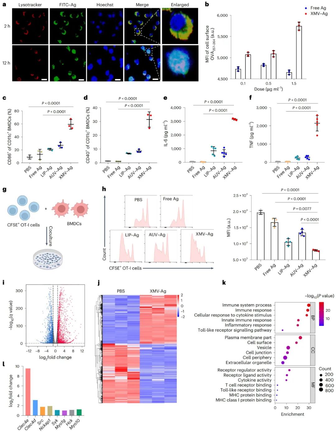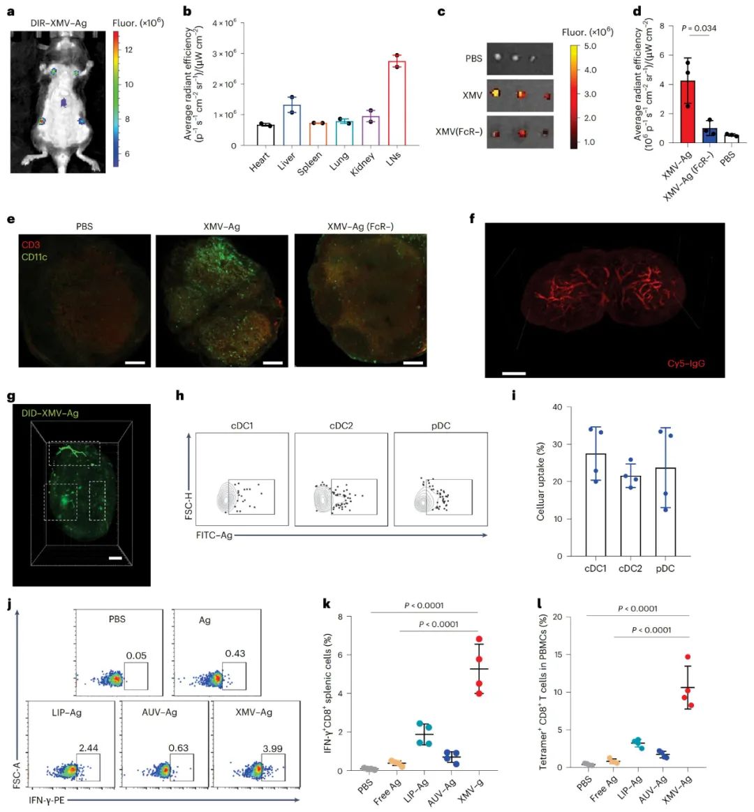 图3 XMVs将抗原特异性递送到淋巴结并诱导强烈的免疫反应