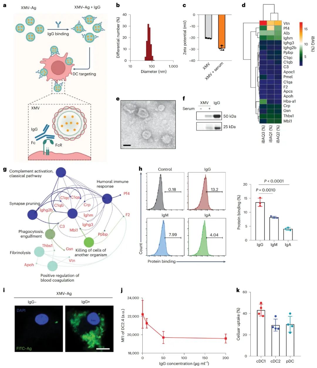 此外,研究发现,不同DC亚型对XMV-Ag的摄取存在差异,表明XMV在抗肿瘤及抗病毒疫苗应用方面具有潜在优势。通过动态光散射、透射电镜和蛋白质印迹实验,研究人员证实,XMV与小鼠血清孵育后会形成富含IgG的蛋白质冠,且IgG在XMV表面的结合水平较高。