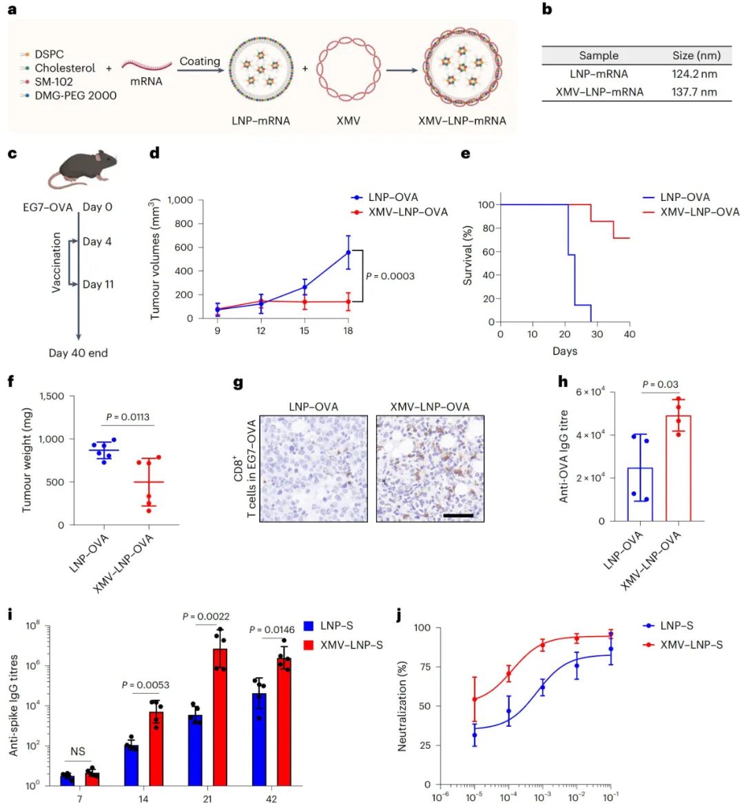 以表达卵清蛋白的小鼠胸腺瘤EL4细胞(EG7-OVA)构建肿瘤模型,用XMV-LNP-OVA和LNP-OVA进行治疗,结果显示XMV-LNP-OVA能显著抑制肿瘤生长,延长小鼠生存期,提高肿瘤组织中CD8+T细胞浸润和OVA特异性IgG滴度,且H&E染色表明其能诱导更高程度的肿瘤细胞坏死。