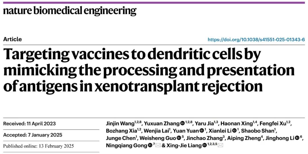 2025年2月,中国科学院大学、国家纳米中心梁兴杰教授和中国科学技术大学宫宁强教授等人的团队在Nature Biomedical Engineering上发表了题为“Targeting vaccines to dendritic cells by mimicking the processing and presentation of antigens in xenotransplant rejection”的研究论文。研究表明,异种细胞膜衍生的囊泡(XMVs)可用于DCs靶向疫苗递送。