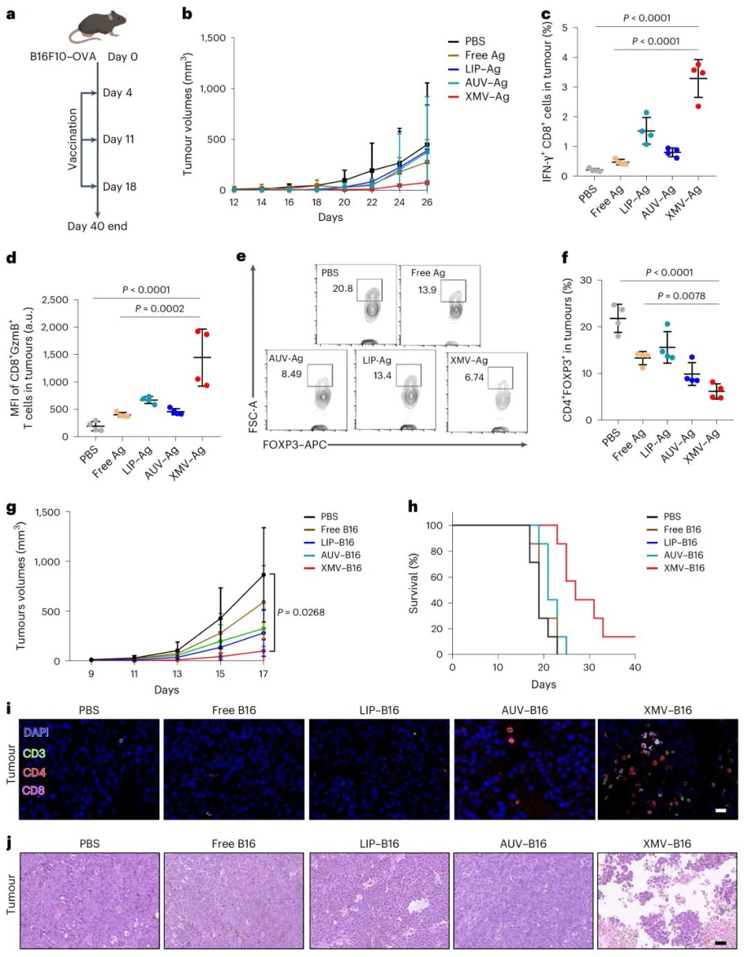 为了给表达卵清蛋白的B16F10-OVA癌细胞构建肿瘤模型,给小鼠接种肿瘤细胞后,分别用XMV-Ag、AUV-Ag、LIP-Ag或Ag进行免疫治疗。监测肿瘤体积发现,XMV-Ag处理显著抑制了B16F10-OVA肿瘤的生长,而其他疫苗制剂的抑制效果有限。