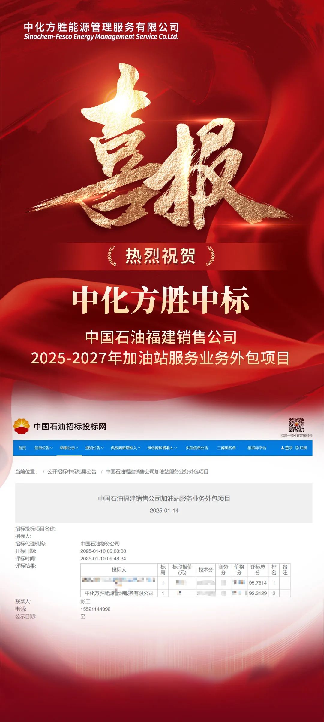 2025年1月14日,中化方胜能源管理服务有限公司(以下简称 “中化方胜”)迎来了2025年的首个喜讯。经过激烈的角逐,中化方胜成功中标中国石油福建销售公司 2025-2027 年加油站服务业务外包项目。这一成果,有力地彰显了公司在能源化工垂直领域,尤其是加油站业务外包领域的专业服务能力。
