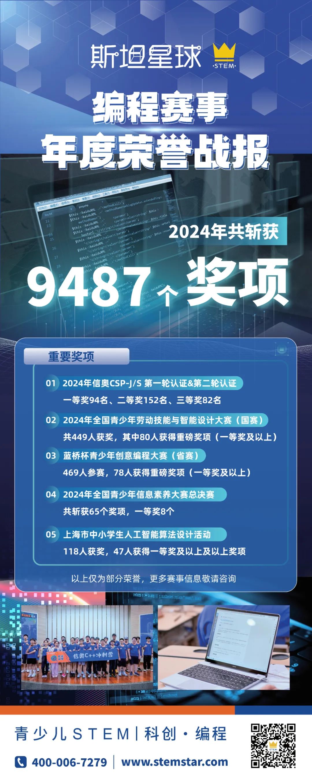 在刚刚过去的2024年,斯坦星球全年编程赛事共斩获9484个奖项。