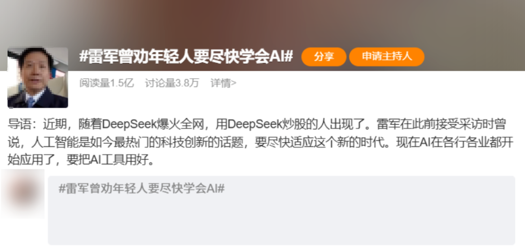 就连小米创始人雷军,在近期采访里都在劝年轻人“尽快学会AI”,相关话题次条还一度冲上热搜,狂揽上亿阅读量。