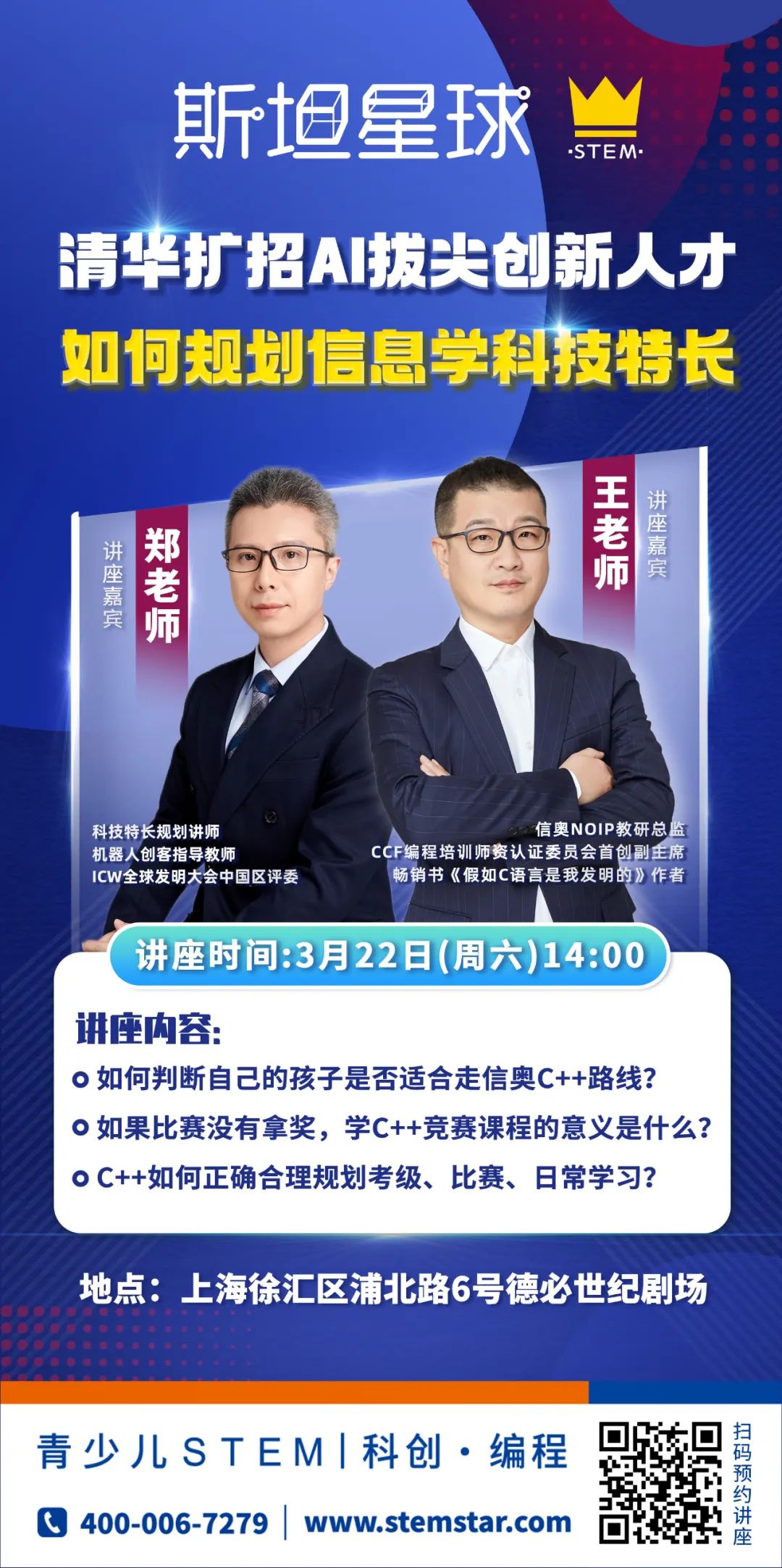 为了帮助广大家长更深入地了解信息学奥赛,在信息学特长生培养的过程中少走弯路,3月22日,斯坦星球特别为大家准备了一场信奥线下讲座——【清华扩招AI拔尖创新人才,如何给孩子规划信息学科技特长?】