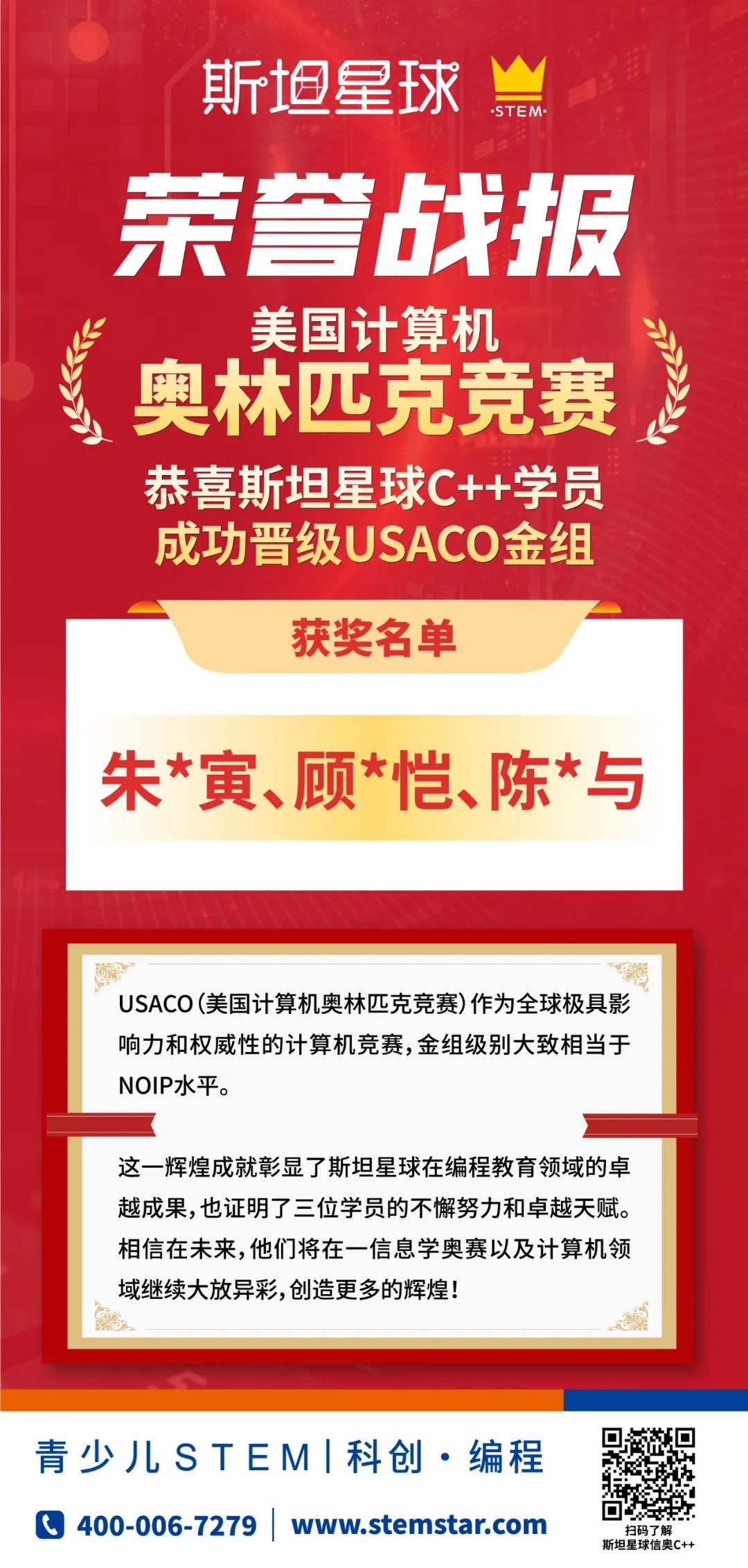 在美国计算机奥林匹克竞赛中,来自斯坦星球的3位C++学员更是表现出色,成功晋级USACO金组!妥妥的别人家的“信奥牛娃”!