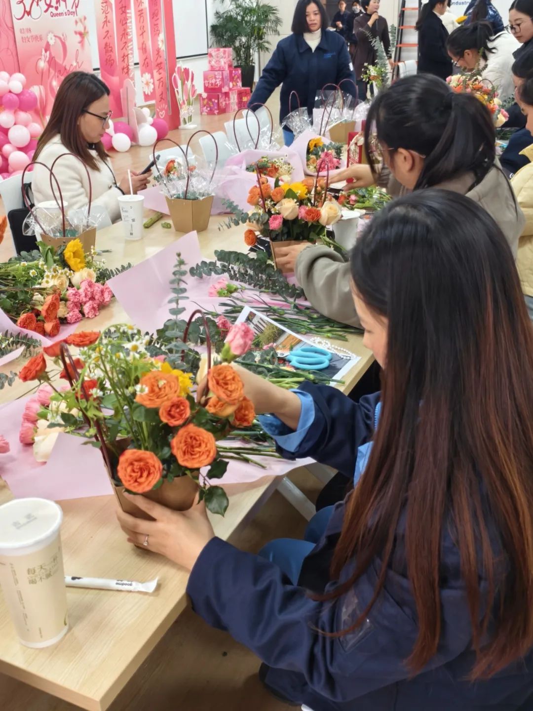 在专业老师的指导下,女神们纷纷化身“花艺大师”,用巧手将一朵朵鲜花组合成独具匠心的花束。每一束花都凝聚了她们的智慧与创意,现场洋溢着欢声笑语,大家不仅学到了插花技艺,更享受到了创作的乐趣。