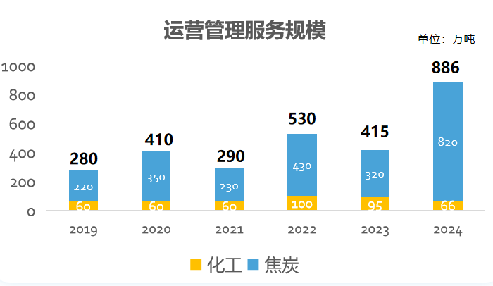 旭阳基于行业深厚的专业底蕴和坚持长期主义的初心,2014年开启了运营管理服务业务,经过11年的探索,将自己深耕焦化和精细化工领域的经验和技术进行整合、固化、提炼、复制,向行业输出专业的运营管理服务,致力为行业赋能。目前,运营管理服务以旭阳独特的核心竞争力和运营管理体系为依托,正在形成新的增长极。2024年,旭阳运营管理服务业务总规模增至886万吨、同比增长114%,业务量实现651万吨、同比增长45.6%,区域覆盖内蒙、宁夏、四川、河南、江苏、山东、吉林等地,旭阳的业务性质也由“成本型、效率型”向“服务型、创新型”转型升级。2025年,集团焦炭运营管理服务的业务规模目标是再增1000万吨,达到1820万吨,化工运营管理服务的业务规模计划再增100万吨达到166万吨,并将继续稳步扩增,提高运营管理服务板块在集团总收入、总利润、总规模的占比,从而进一步优化业务结构。