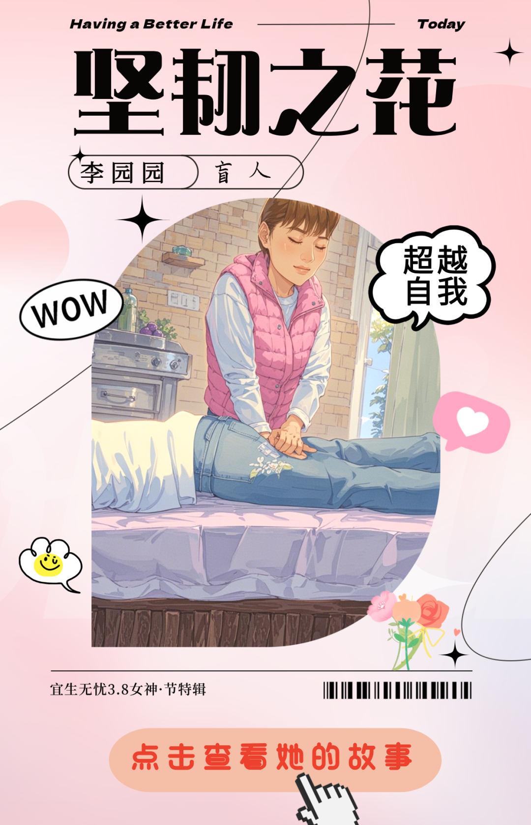 通过宜生无忧走花路!生命的色彩从不因困境而黯淡,女性的力量从不因挫折而衰减。每一位女性都是生活中的英雄。她们用自己的方式诠释着什么是真正的勇敢、什么是无畏的坚持。让我们在这个节日里,为她们送上最真挚的祝福:愿她们的生活充满阳光,愿她们的梦想都能实现,愿她们在未来的日子里,继续绽放属于自己的光芒。同时,宜生无忧也会用更多的关爱和支持,为她们创造一个更加包容、更加温暖的平台。