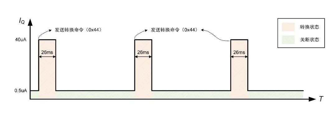 对于不支持连续测量模式的传感器而言,因为其内部没有定时器模块,所以不存在空闲状态。主机只能借助通信接口来手动唤醒进入转换状态。一旦转换结束,传感器会自动回到关断状态。下图以GX1833为例,展示了不同状态下的静态电流。
