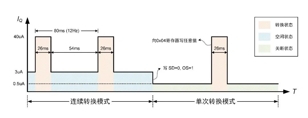 而对于单次转换模式而言,每一次转换均由主机手动唤醒,因此并不存在所谓的测量周期。为此我们一般默认主机每隔1s启动一次转换,平均静态电流的计算公式也对应调整为: