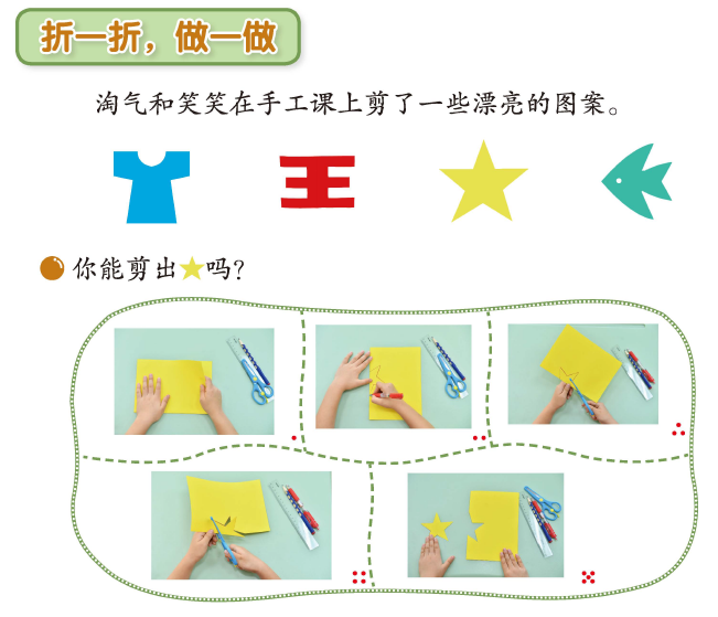 第五版教材设计了类似“先想一想,再做一做,再想一想”的学习活动,引导学生在图形运动的学习中先想一想,独立观察和想象,尝试做出判断,然后看一看、做一做,每个学生自己进行操作,剪几个一样的图形或准备一些小的学具摆一摆;最后对实际看到的和想象的进行比较,回想图形的运动过程。在这个过程中,学生想象和思考图形运动可能的状态,经历操作体验图形运动的过程和验证想象的过程,而操作和想象的结合又促进学生在头脑中建立正确的表象,发展空间观念。