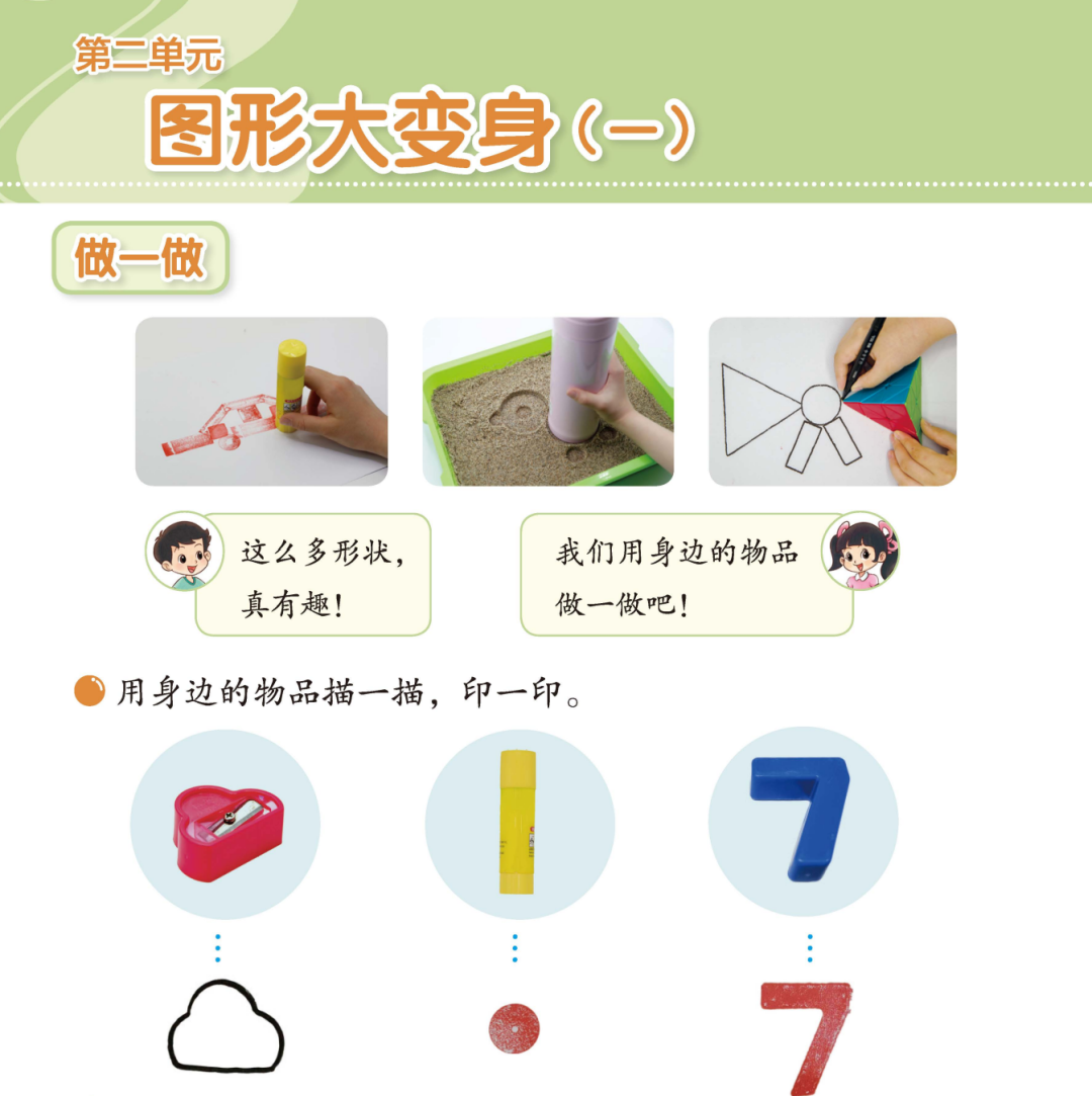 2022年版课标增加了表达、感知等词语,学生需在操作过程中感知、想象与表达。第五版教材设计了大量体现任务导向的操作活动,为学生的数学学习提供“脚手架”,帮助学生积累活动经验、发展想象力。例如,一下“图形大变身(一)”单元中,第1课时借助实物的描、印等活动,引领学生基于立体图形得到平面图形;第2课时根据印出的平面图形的形状,引领学生借助想象、推理,想象对应的立体图形,再通过印一印的活动去验证;第3课时“影子剧场”借助投影活动,帮助学生进一步积累认识图形的经验。这些操作活动为学生的想象和思考提供了有效支持,让学生充分经历抽象、识别、想象、对比、操作、验证的思维过程,体会立体图形和平面图形之间的关联,积累观察和思考的经验,提高观察、想象和动手操作能力,发展空间观念。