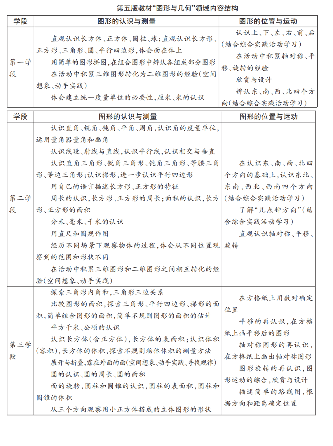 根据2022年版课标的课程内容设计,第五版教材“图形与几何”领域的两个主题在各学段之间的内容相互关联、螺旋上升、逐段递进,各学段相关主题内容结构如下表所示