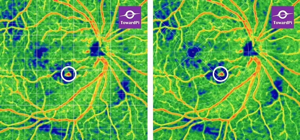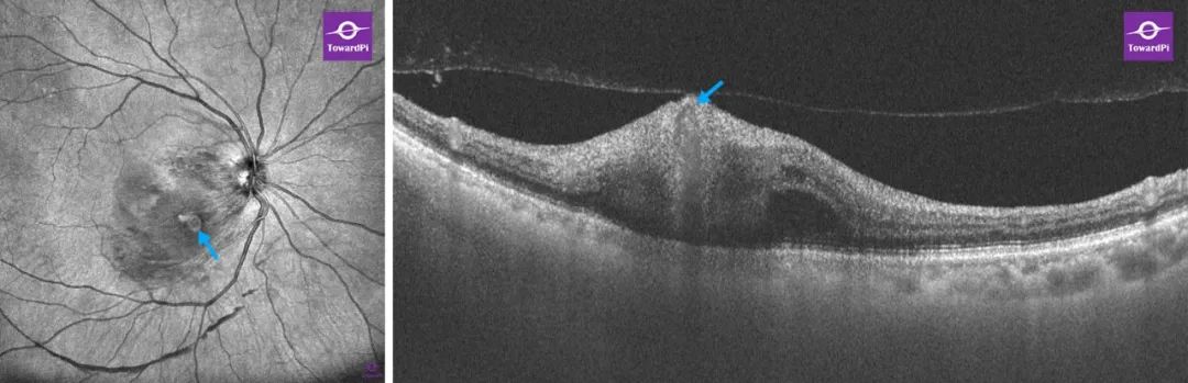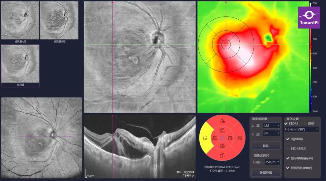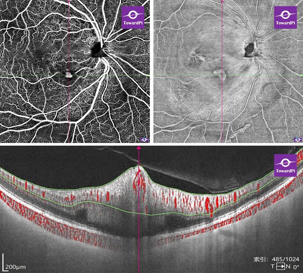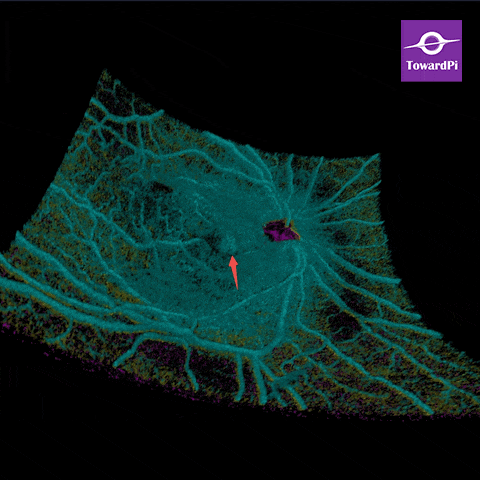 3D OCTA:切换至3D OCTA模式可更直观的观察到大动脉瘤体形态,及黄斑区及视盘颞下方的局部隆起。