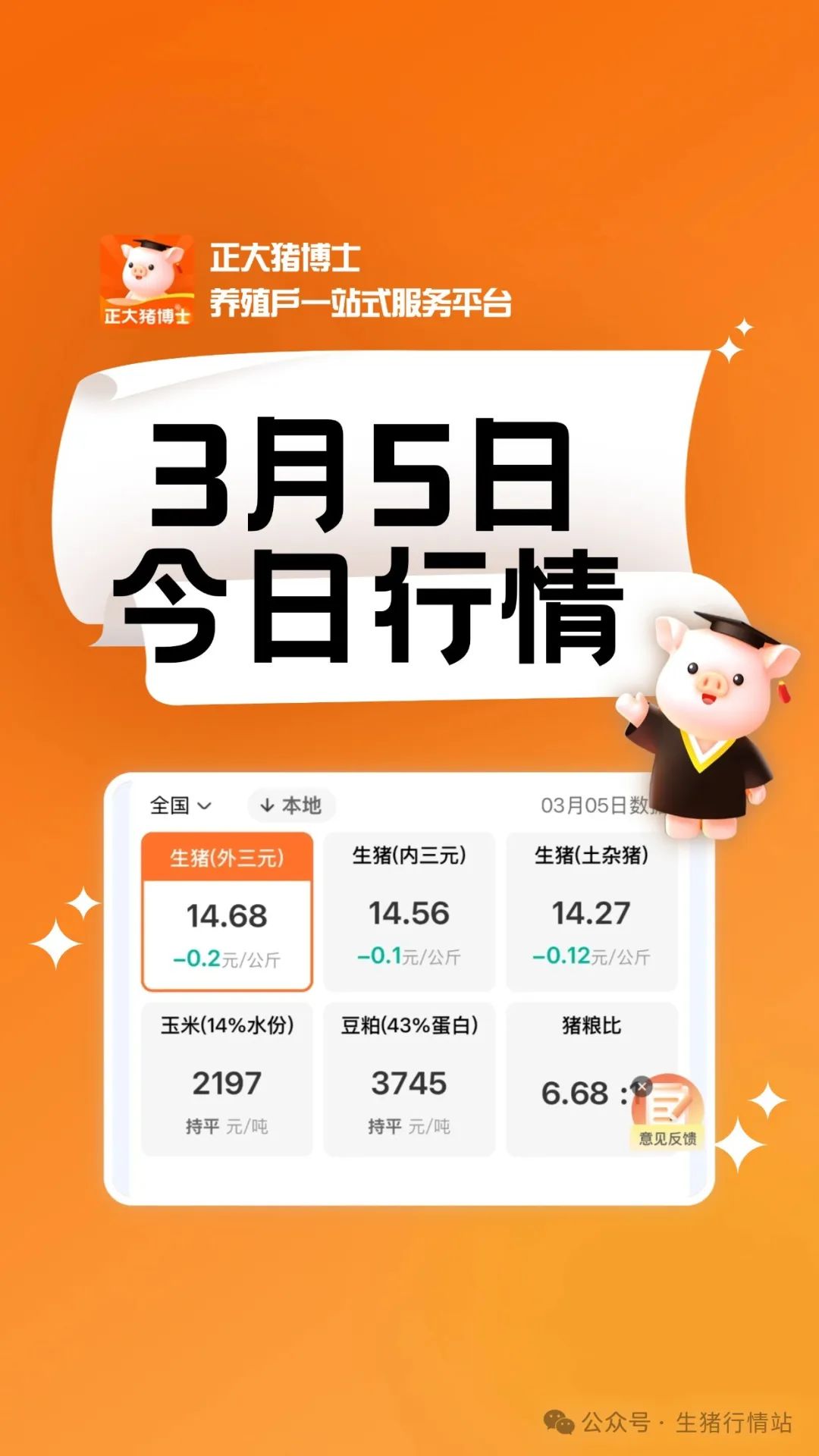 3月5日最新猪价来了!今日生猪外三元全国价格下降,每公斤14.68元;内三元价格下降,每公斤14.56元;土杂猪价格降至每公斤14.27元;玉米原料价格持平,每吨2197元;豆粕价格持平,每吨3745元;全国猪粮比为6.68:1。