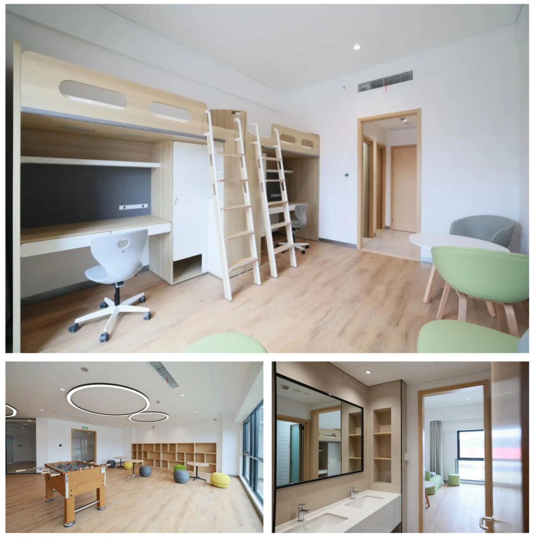 宿舍分为双人和四人两种规格的房间,并配备独立的卫浴;还开设了休闲和公共活动区域以及一个露台式的“元气森林”。
