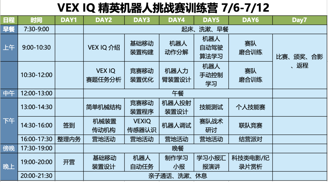 7天6晚沉浸式学习,挑战编程超能力。课程对标“天花板”级别赛事——VEX机器人大赛,带你打开一个全新的智能世界。