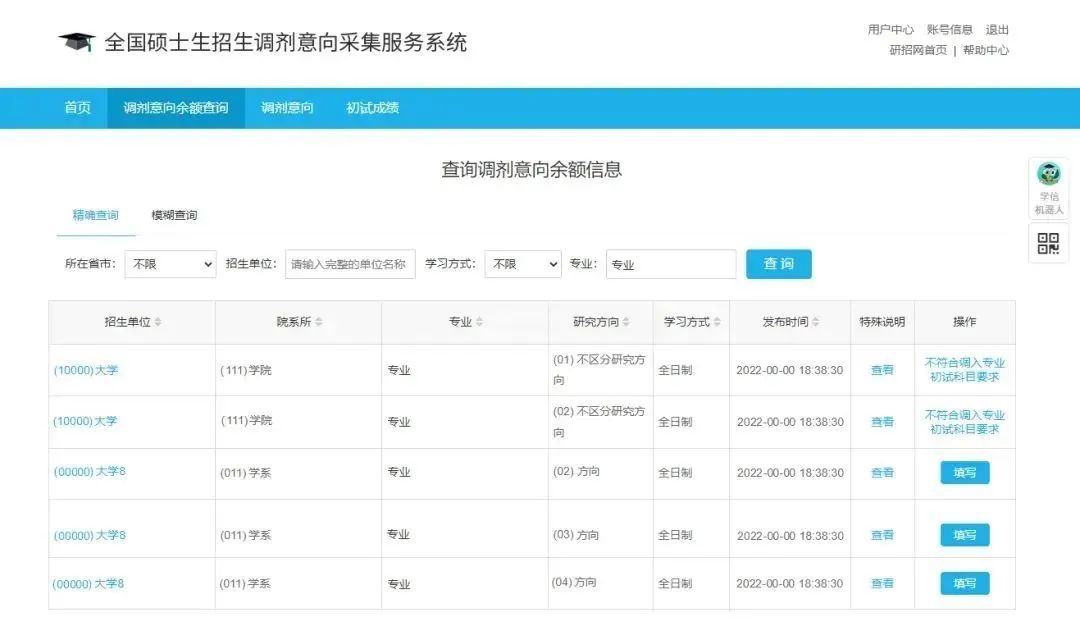 注意:意向余额信息是不断更新的,同学们需要随时刷新查看。了解招生单位发布的调剂意向余额情况,做好调剂准备。