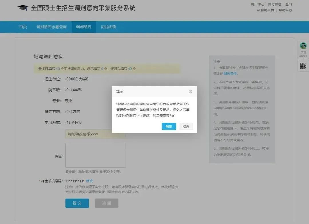 注意:在允许填写调剂意向的时间内,一位考生最多可填写10个平行调剂意向,且提交后不可取消或更改。