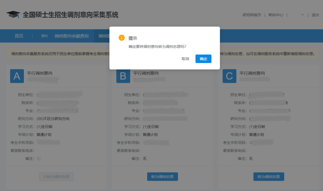 第五步:4月8日,调剂服务系统开通后,在满足条件的前提下,考生可将调剂意向转为调剂服务系统中的调剂志愿(最多只能转3个)。