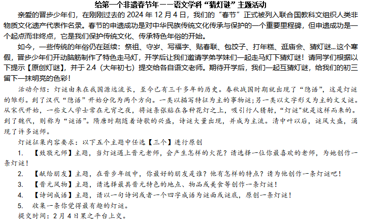 晋步少年以“制作走马灯”为媒介,串联物理、语文、数学的智慧火花,三视图的严谨投影化作走马灯的设计密码;语文学科猜灯谜主题活动中,灯谜创作与诗词成语碰撞出趣味灵感。学生们在动手实践中发现,传统文化不仅是历史的沉淀,更是学科知识的生动载体。同学们的优秀作品,正是这种跨学科思维的最佳注解。