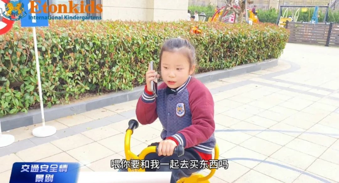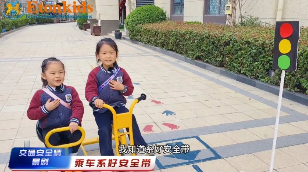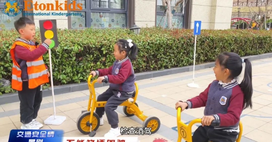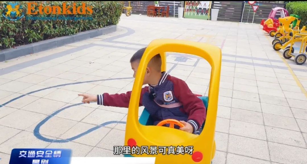 老师让一名幼儿扮演“司机”,另一名幼儿扮演“交通警察”,当司机将头手伸出窗外时,交警会及时纠正错误行为,借此场景演练,老师告诉孩子们“行车时要坐好扶稳,头手不外伸”。