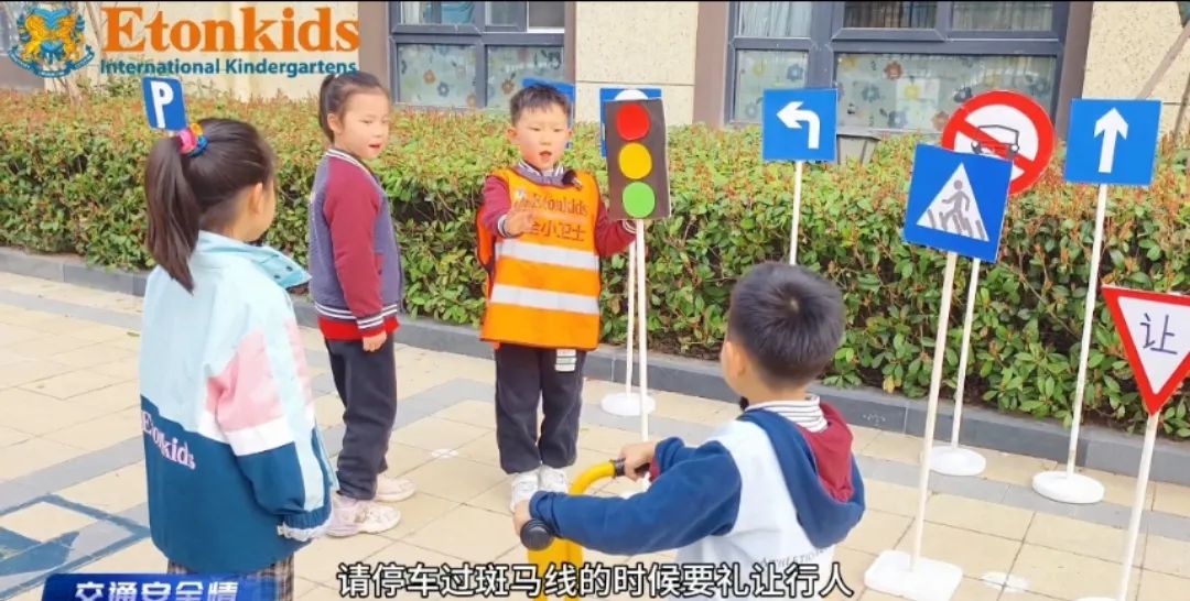 场景模拟中,当“行人”站在斑马线旁准备过马路时,“司机”需减慢车速,在斑马线前停车,挥手示意“行人”先过。让孩子们明白行车需礼让行人。