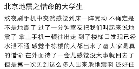 人大校内本科生和硕士生居住的宿舍楼下挤满了下楼避难的学生,博士生宿舍楼几乎毫无动静。