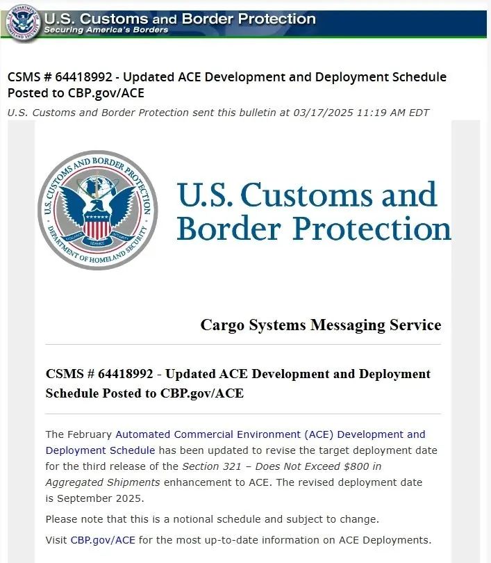 美国海关与边境保护局(CBP)于2025年3月宣布,针对Section 321条款的**自动化商业环境系统(ACE)**将于同年9月完成功能升级,核心变化包括: