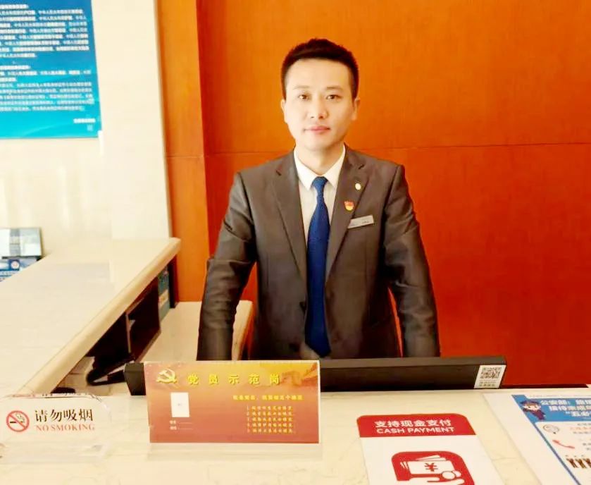 大堂前台接待台醒目的位置,设有“党员先锋岗“的标识,党员佩戴党徽上岗,提醒党员牢记初心、使命和担当;同时,通过党员流动服务岗,树立榜样的作用,提升服务内核。