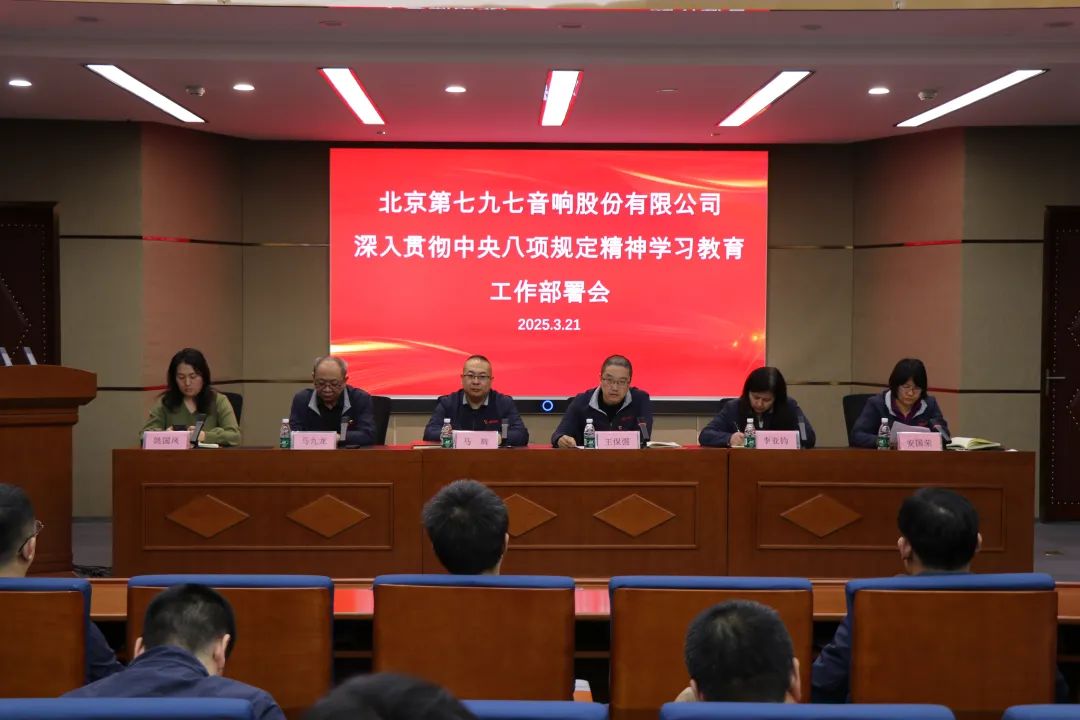 3月21日下午,七九七音响公司党委召开深入贯彻中央八项规定精神学习教育工作部署会,旨在进一步统一思想、明确方向,全力推进学习教育工作落实落细,为公司发展注入强劲的作风动力。党委副书记、纪委书记、工会主席王保强同志主持会议,党群工作部部长安国荣同志传达《关于在大华公司开展深入贯彻中央八项规定精神学习教育的实施方案》,党委书记、副总经理马辉同志发表讲话。参加此次会议的有七九七音响公司领导班子成员、中层干部、各党支部书记和支部委员。