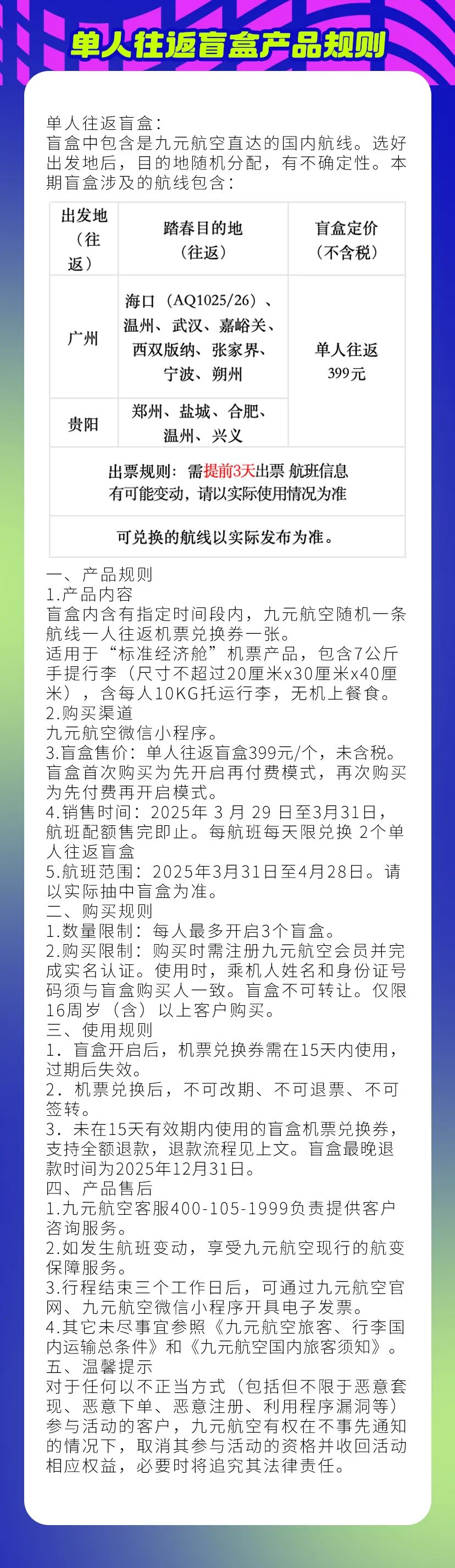 (6)适用航线:九元航空实际承运的所有国内国际直达、经停航班。