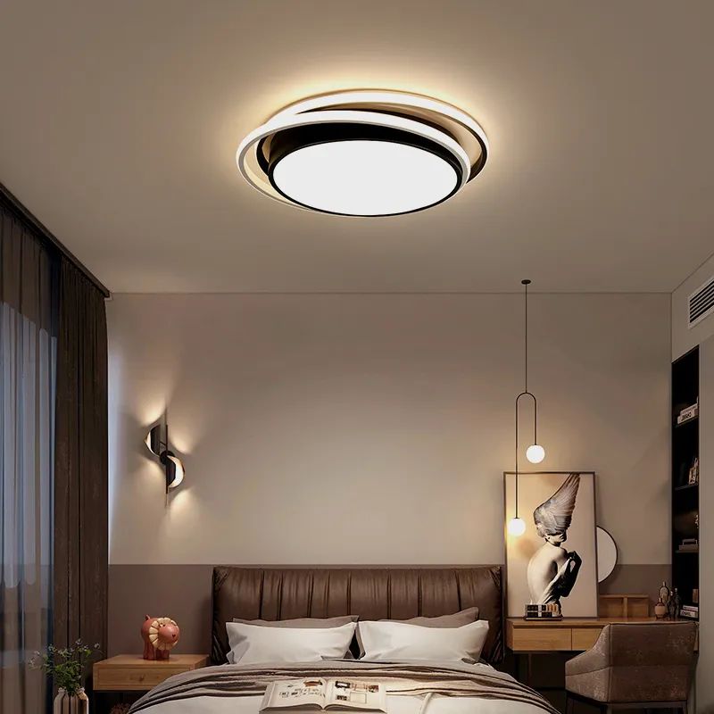 选择一盏吸顶灯或者小型吊灯作为主照明,光照强度在50-100Lux之间即可,并且灯具不要直接安装在床的正上方直射,不仅会影响个人健康,而且会影响一个人的情绪。