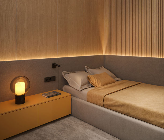 卧室灯光不能太刺眼,光源过于强烈会影响睡眠质量,色温介于3000-3500的柔和、温馨的暖色灯光更容易让人精神放松。