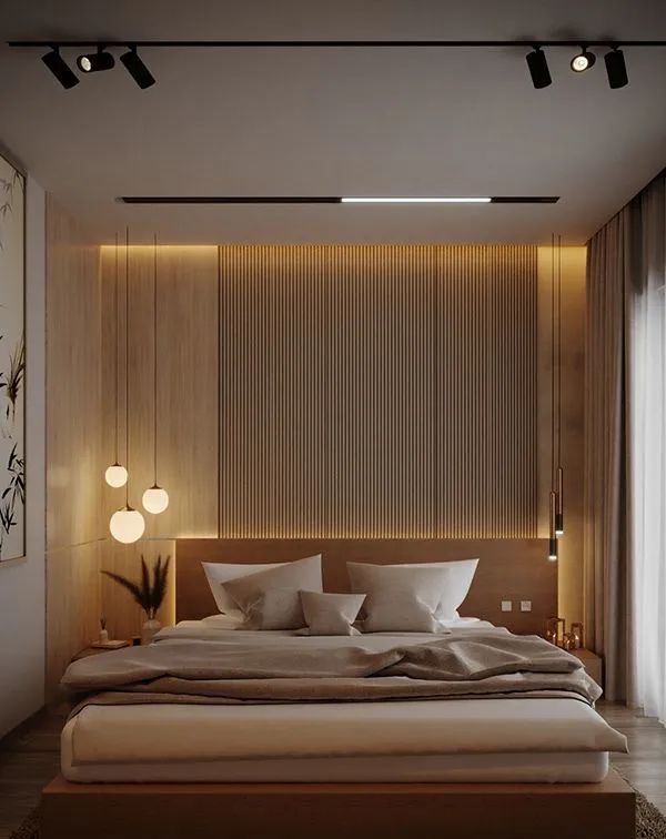 也可以在卧室中使用无主灯设计,把空间的光源做分散处理,射灯、筒灯、磁吸轨道灯、床头壁灯、落地灯等不同的组合,营造出舒适随性的空间氛围。