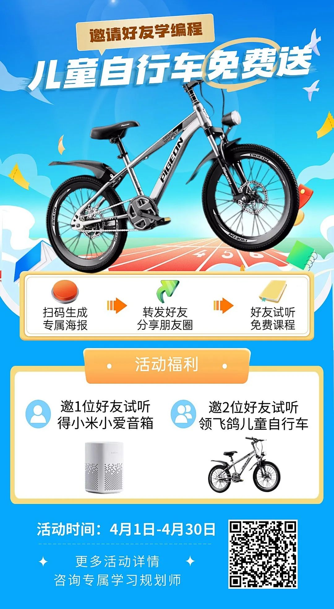 好友通过您的专属推荐海报扫码注册,并在活动时间内参与妙小程编程试听课。