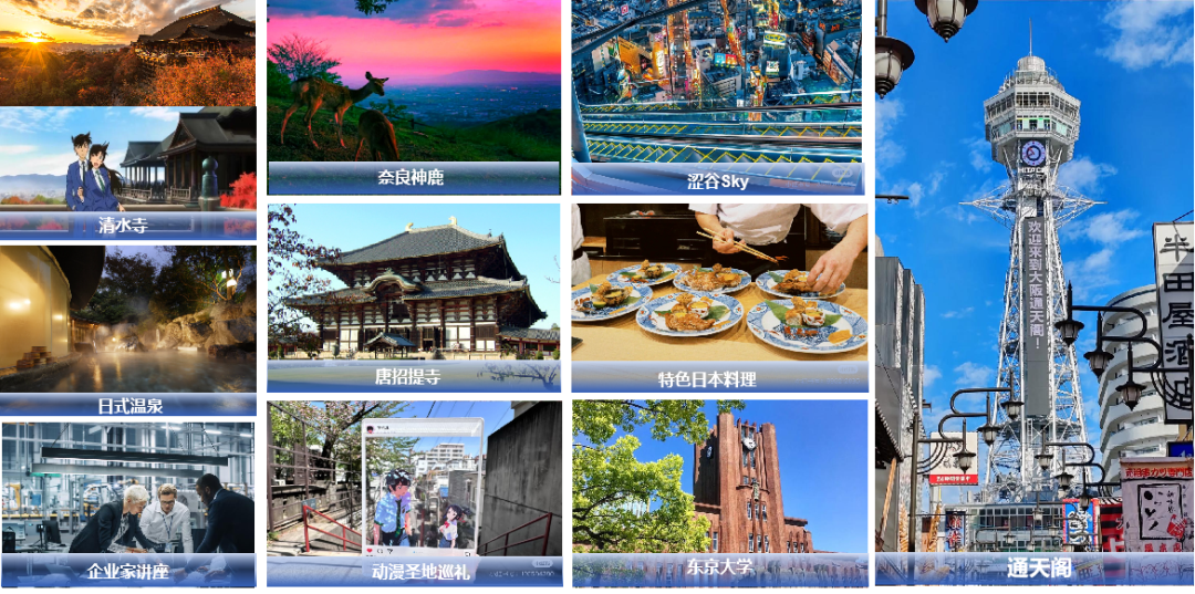 从第一天在地启程,探索公寓周边环境,开启留学生活初体验;到大阪的学术赋能、关西的古都解码、东京的智识碰撞;再到最后一天返程时的成果整理与满载而归,每一天的行程都精心安排。学生们将在不同城市间感受多元文化的魅力,参与丰富多样的学术课程、文化活动与企业实践,收获知识、成长与珍贵的回忆。当然,具体行程会根据实际情况进行调整,确保每一次微留学之旅都能顺利、圆满。