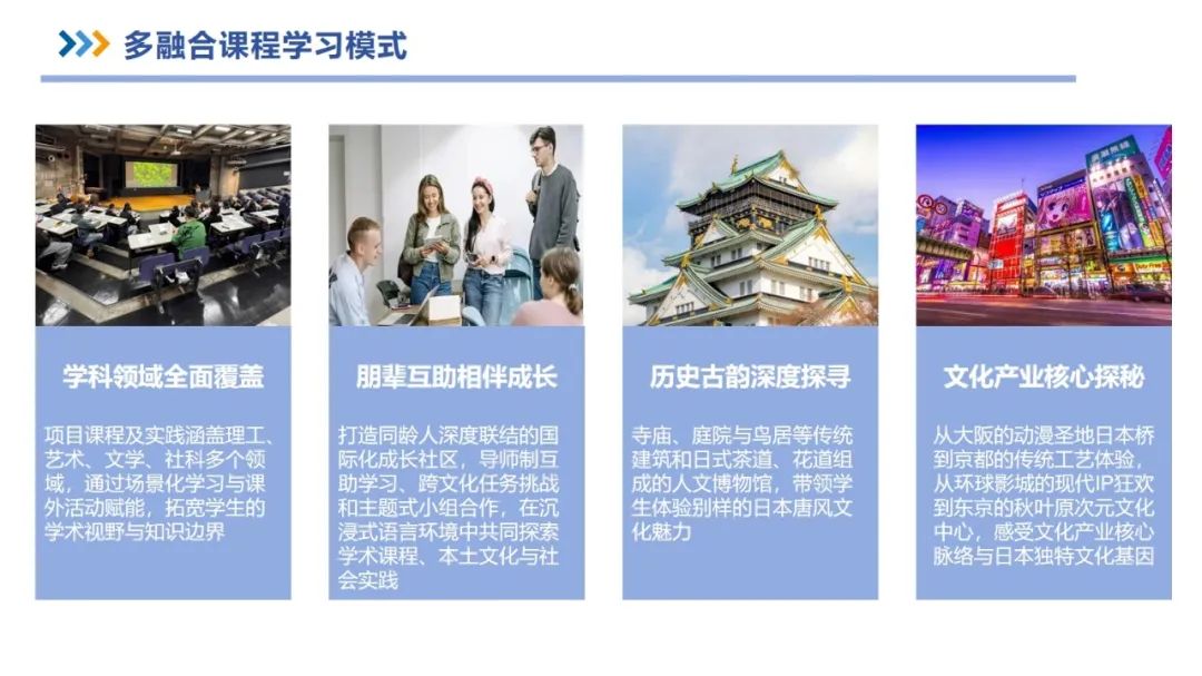 此次日本微留学项目,以创新的无边界联合育人模式为指引,致力于突破传统游学浮于表面的局限。它以深度体验为核心,巧妙地将城市化作课堂,把实践当作教材。在这短暂而珍贵的时光里,让学生们得以深入日本教育、文化、产业的内核,全方位培养全球视野、跨文化理解力与创新思维,为未来的发展奠定坚实基础,培育面向世界、引领时代的未来之星。