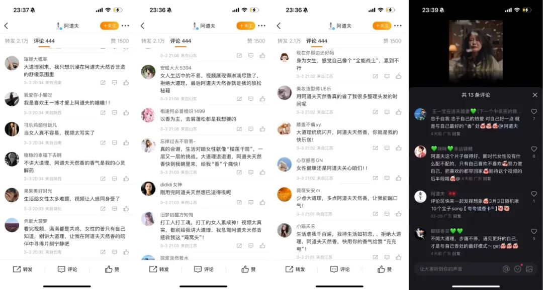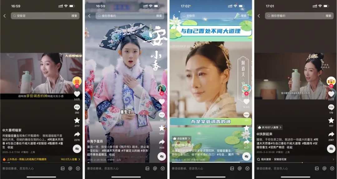 也因为安陵容在大热影视IP《甄嬛传》里深入民心的形象,在抖音平台上,阿道夫系列魔性视频也引来大量剧粉及影视达人的激情魔改。二创内容成功推动话题迅速破圈,这也是我们最开始锚定安陵容的初衷,从声量与“调香”DNA双向赋能阿道夫三八妇女节营销。