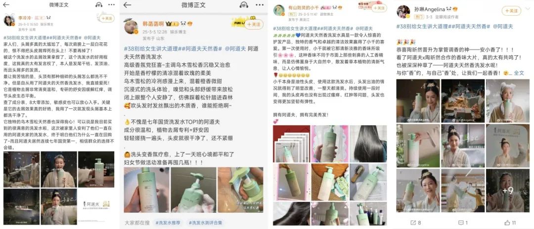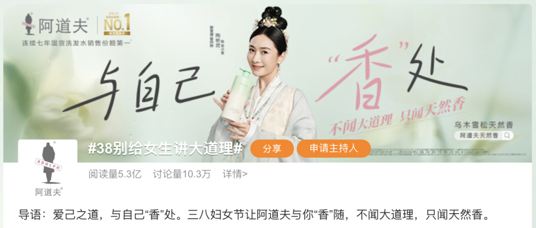 为了把反传统反说教营销进行到底,阿道夫差异化营销话题#38别给女生讲大道理#登陆微博热搜,收获了5.3亿+阅读量,掀起近10.3万+讨论量,带动不同身份的女性加入UGC讨论热议,好评如潮。