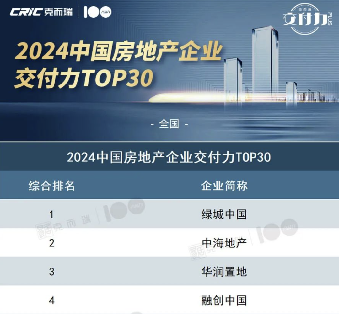 3月19日,克而瑞发布“2024中国房地产企业交付力TOP30”榜单,榜单对交付总规模、交付及时性、交付满意度和交付体系完整性四大维度进行测评,融创中国综合排名位列第4,相比2023年再进1位,充分展现出行业对融创交付实力的高度认可。
