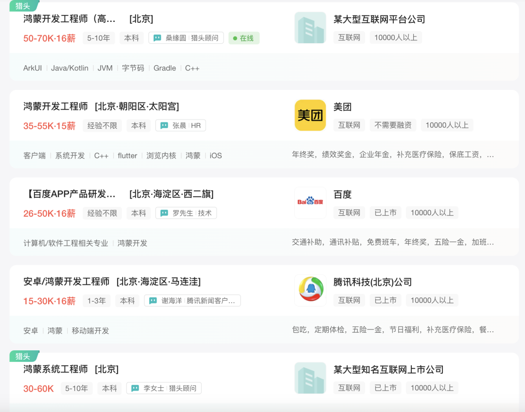 头部互联网企业加速鸿蒙原生应用的适配,催生出了大量开发者岗位,鸿蒙开发工程师已经成为求职市场上的香饽饽,有许多企业甚至选择放宽学历限制,优先录用实战能力强的开发者。