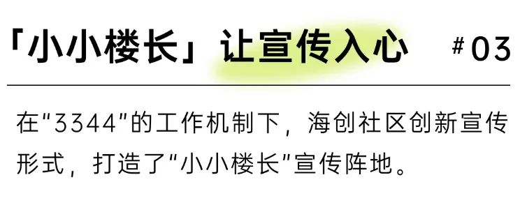 为进一步发挥小业主的带动作用,自2021年以来,海创社区联合中海实验小学和社区社会组织服务中心推出了“小小楼长”线上有害垃圾回收公益岗:每幢居民楼设置1-2位小楼长,居民家中产生有害垃圾时,只需在居民群内@居民助理,填写“工单”,管理员会将“工单”派发给小楼长的家长;家长接单后,小楼长上门回收有害垃圾,代表社区送上小礼品,再将收集到的有害垃圾送至社区党群服务中心,并获得相应的志愿积分。
