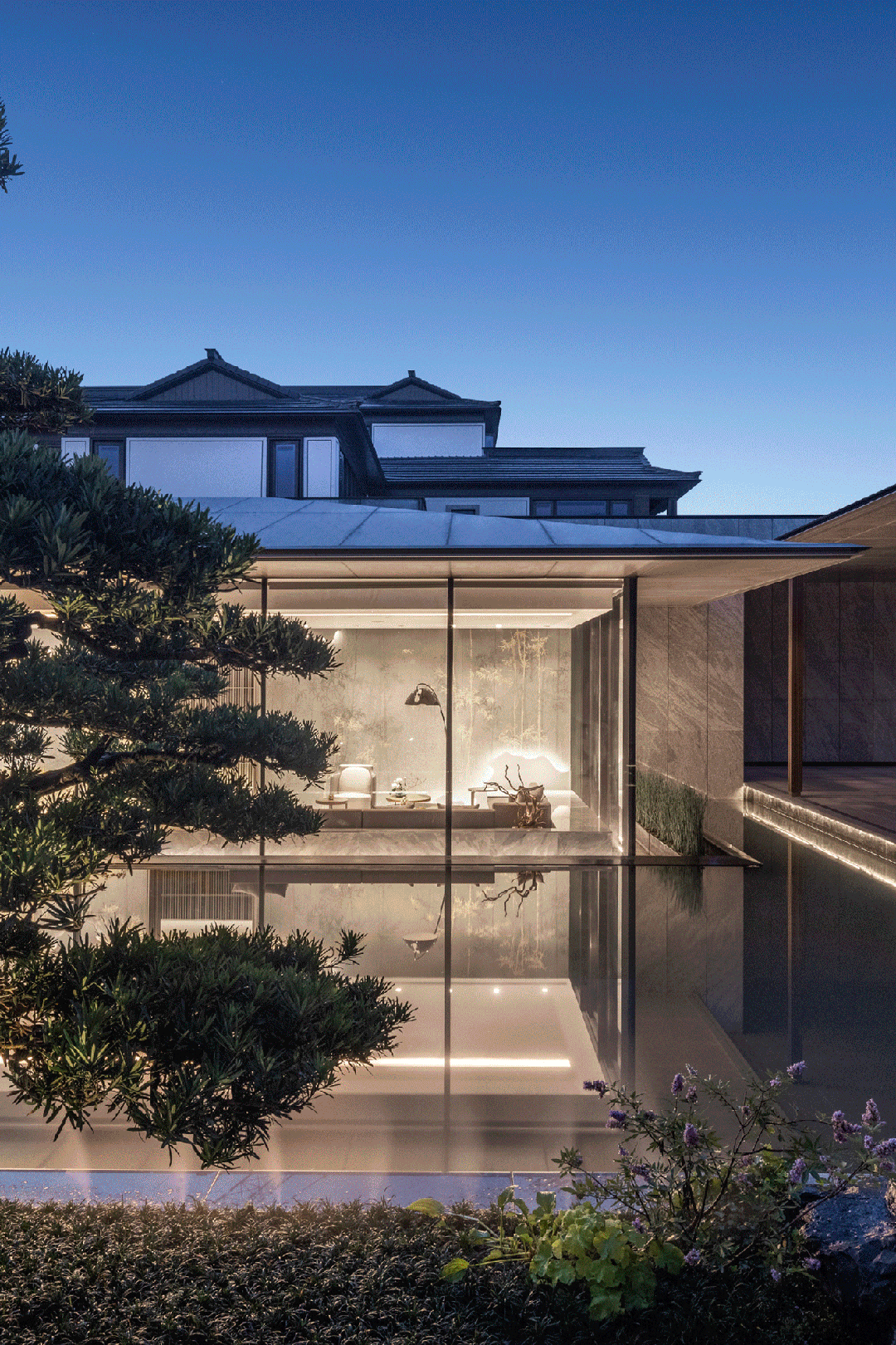 步入宁波宜和东方合院,仿若进入江南婉约诗篇。项目深入解读宋代刘松年《西园雅集图》,汲取传统古典园林多进式院落空间的精髓。通过对山水走势、水埠形态、路桥形态等东钱湖自然人文现状抽象解构,并结合“钱湖十景”元素意向,以拟态化表达手法和现代设计笔触,营造出富有江南生活情节的社区景观。