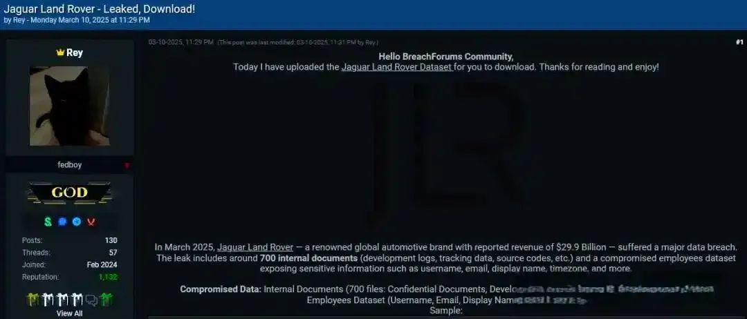 与此同时,捷豹路虎(JLR)也同样遭到了该组织的勒索攻击,不仅内部系统遭受入侵,还有约700份内部文件惨遭泄露。此次泄露的文件涵盖了大量敏感的技术和运营数据,包括专有源代码、车辆开发日志、跟踪数据集以及包含员工用户名、邮箱地址、显示名称和时区的员工数据库。